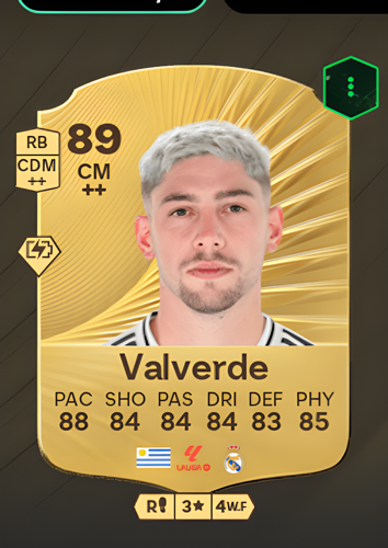 Federico Valverde's Gold Rare card stands out as a dynamic Center Midfielder with an impressive overall rating of 89, boasting well-balanced attributes such as 88 pace, 84 shooting, 84 passing, 84 dribbling, 83 defense, and 85 physicality. This combination makes Valverde a formidable presence in the midfield, capable of driving the attack forward, distributing precise passes, and contributing defensively. His excellent pace and physicality allow him to cover ground quickly and win crucial duels, while his strong shooting and passing make him a versatile asset who can both create and finish scoring opportunities, helping you control the game and break down opposition defenses with ease.